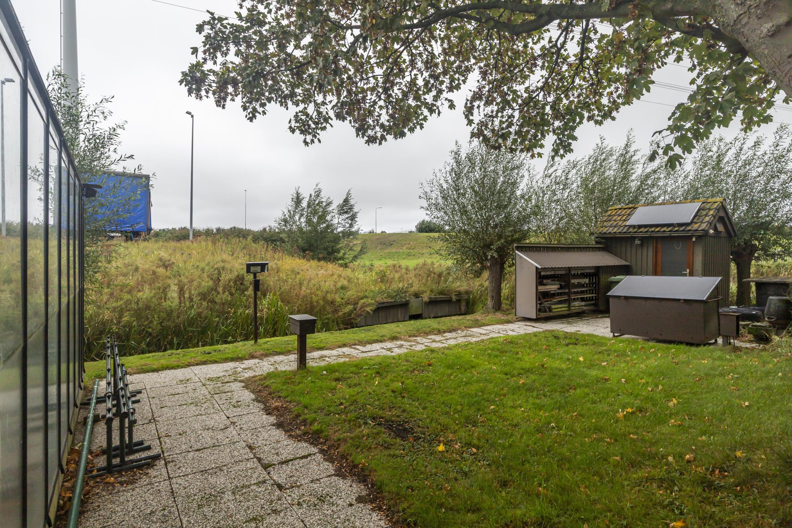 De tuin is groot en veelzijdig. Achterin staat een volledig geïsoleerde schuur van 22 m²