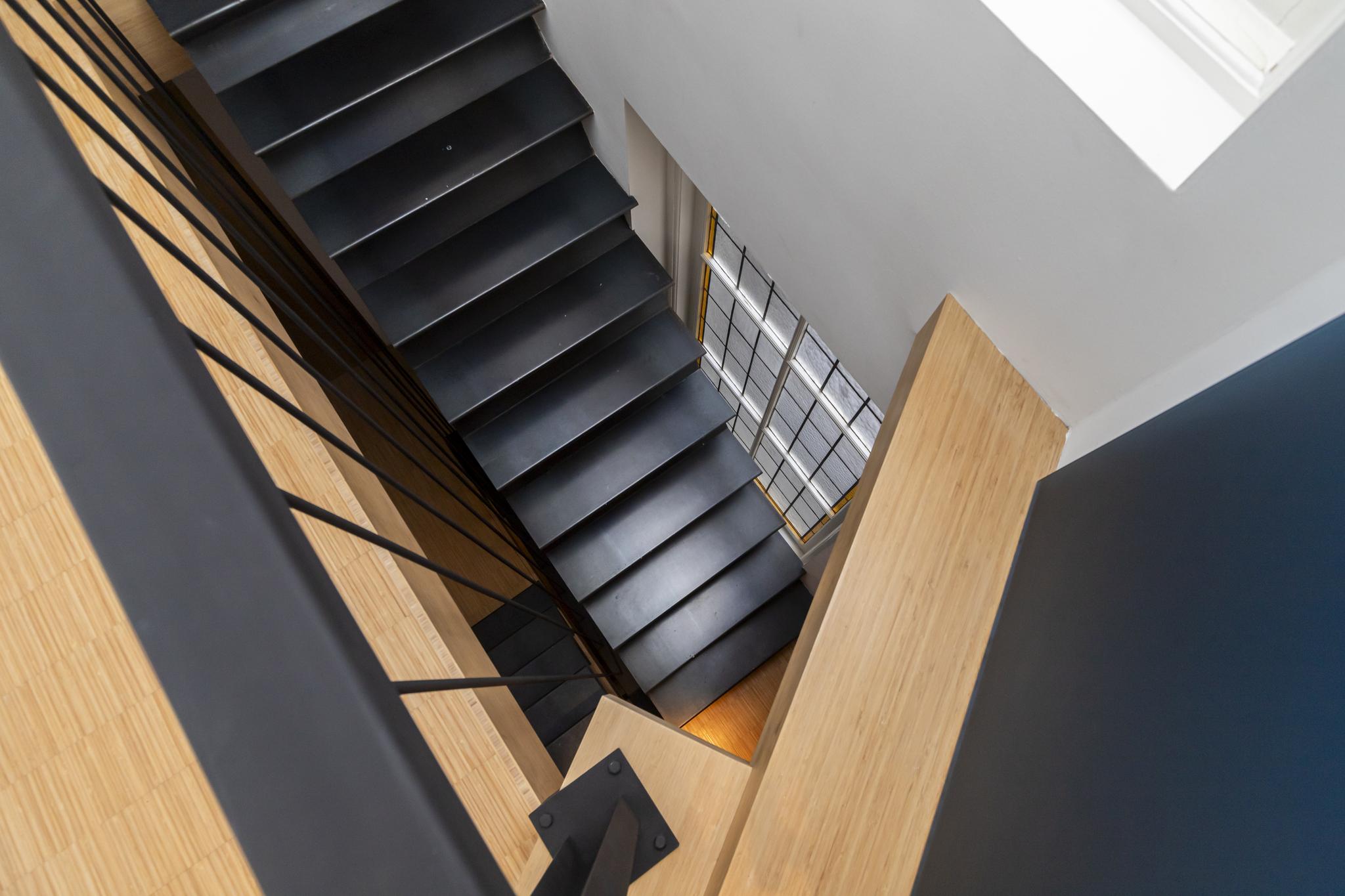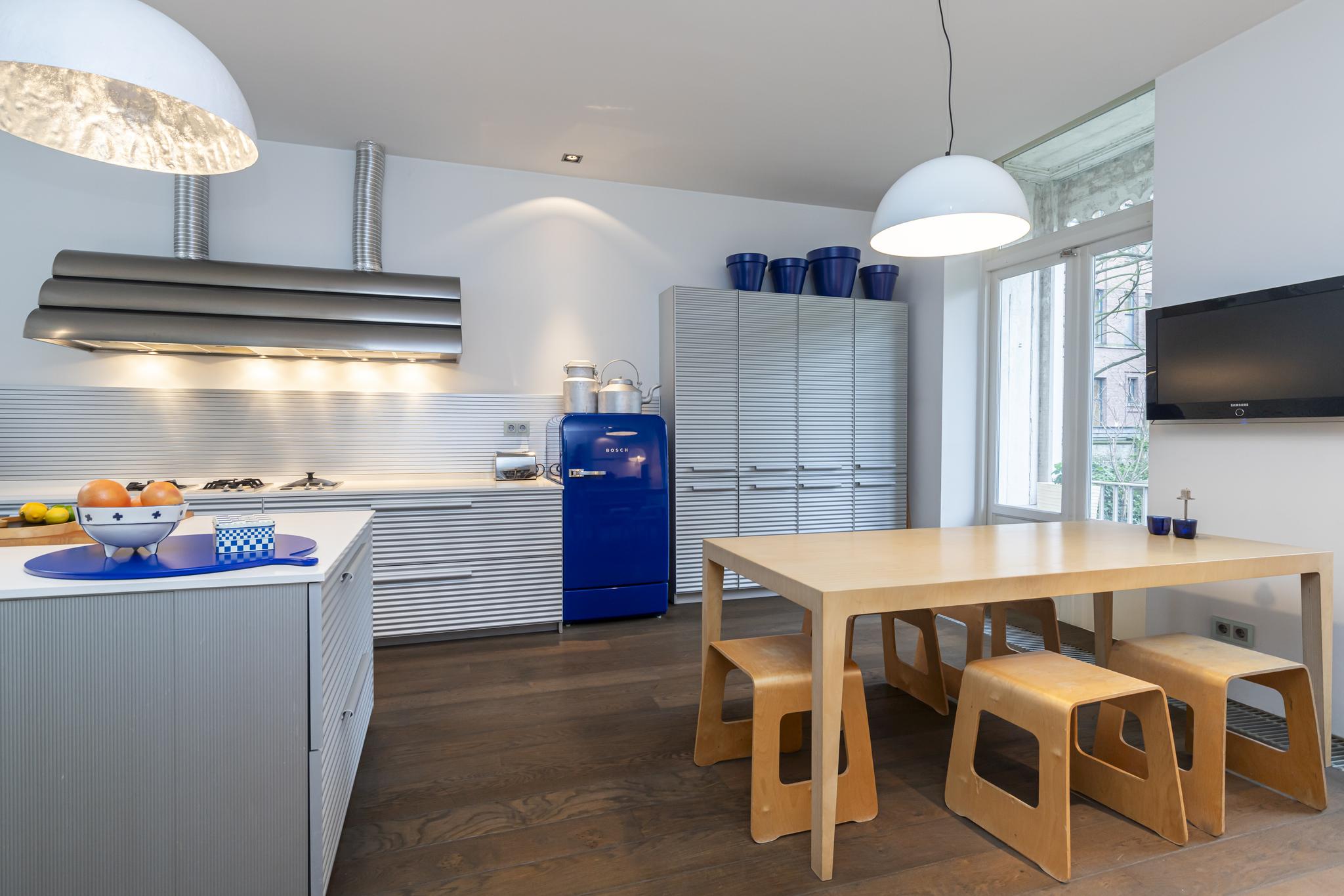 The spacious kitchen is equipped with luxury built-in appliances, including a dishwasher, 3-burner gas stove, and a Gaggenau Domino Element steam cooker. A staircase leads up to the large living room at the front and a spacious bedroom with a walk-in closet at the back, connected to a second balcony (southwest).