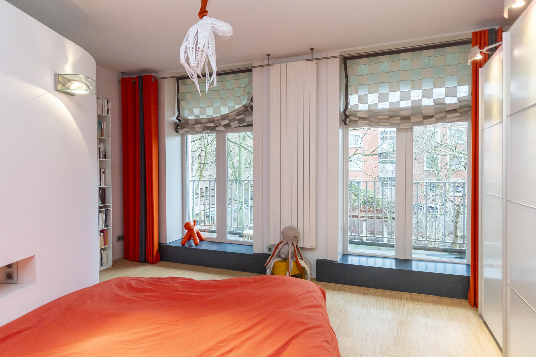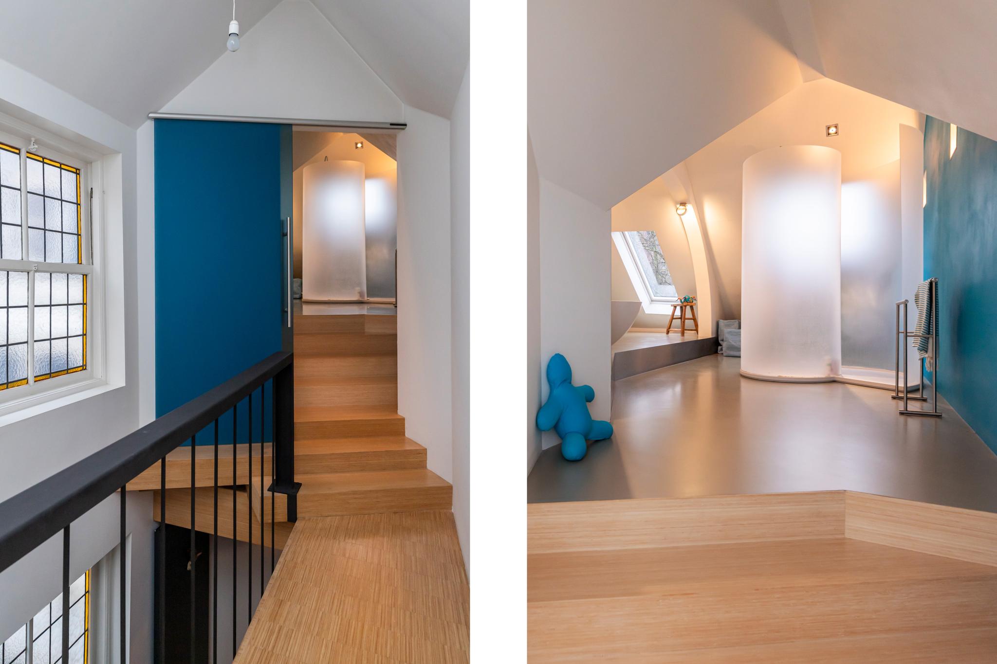 De volgende verdieping herbergt een ruime slaapkamer aan de voorzijde, eventueel op te delen in twee kamers, en een unieke badkamer aan de achterzijde.