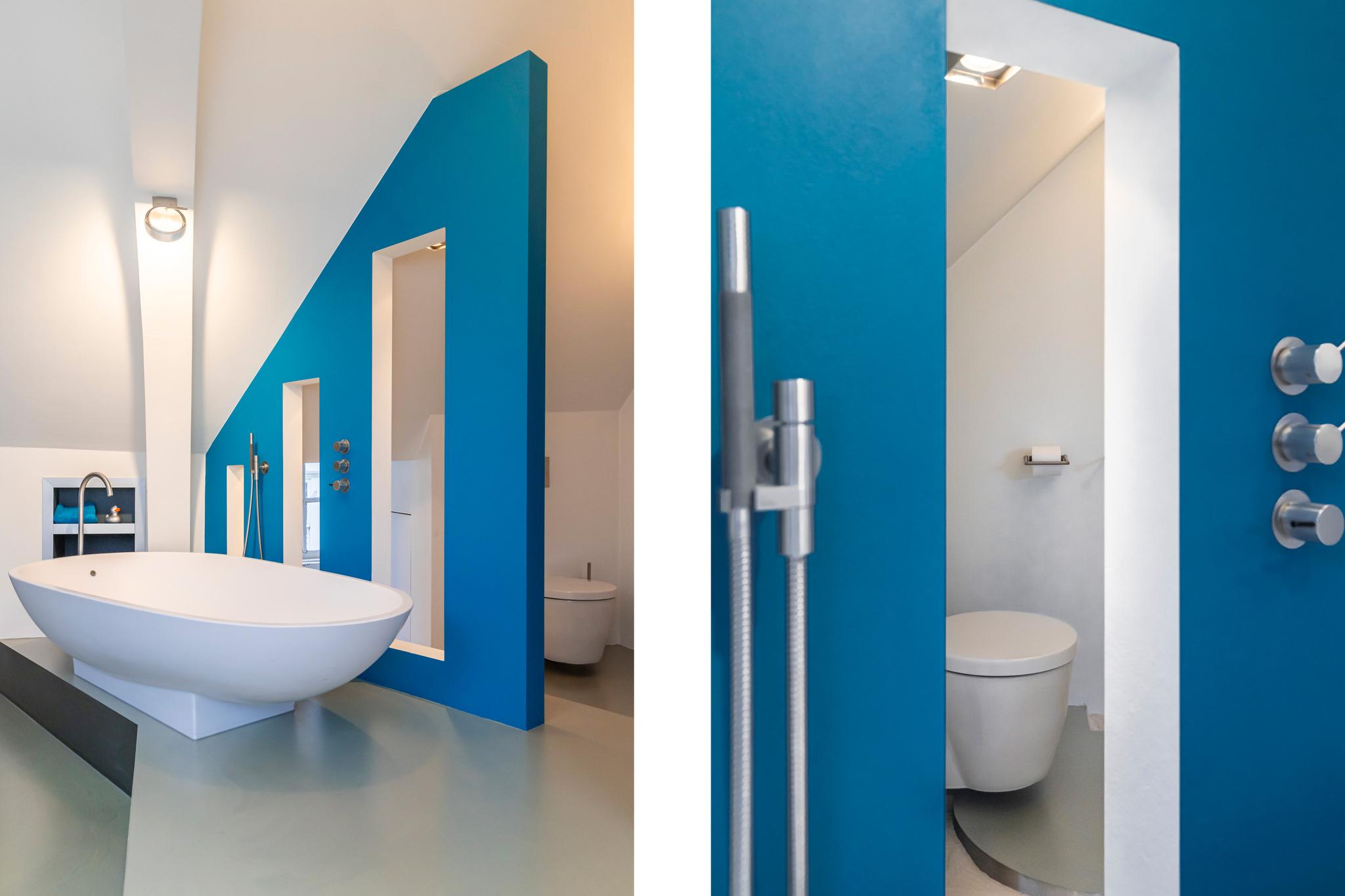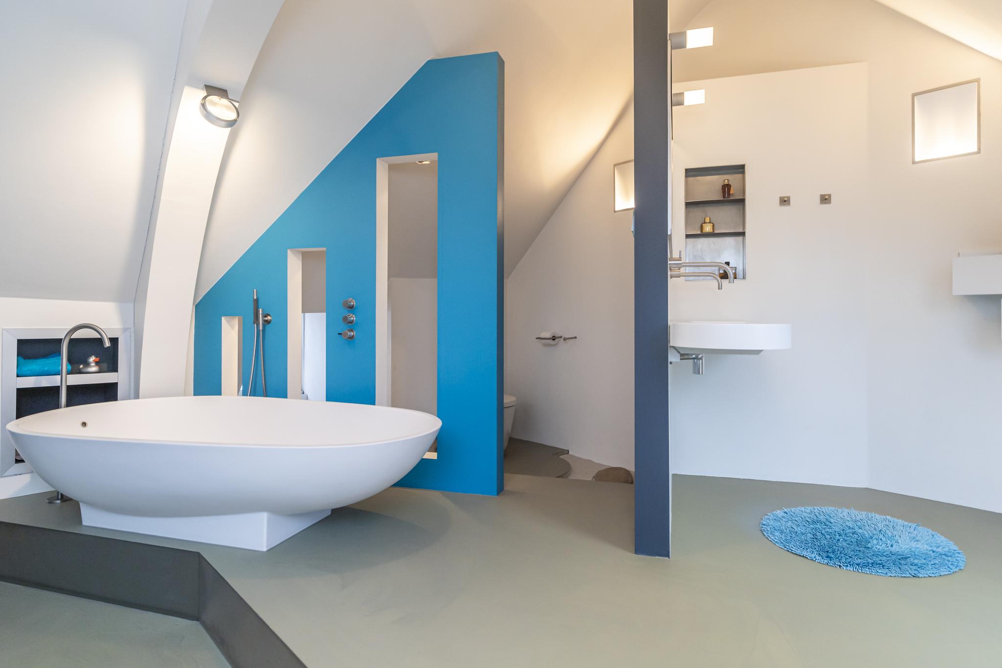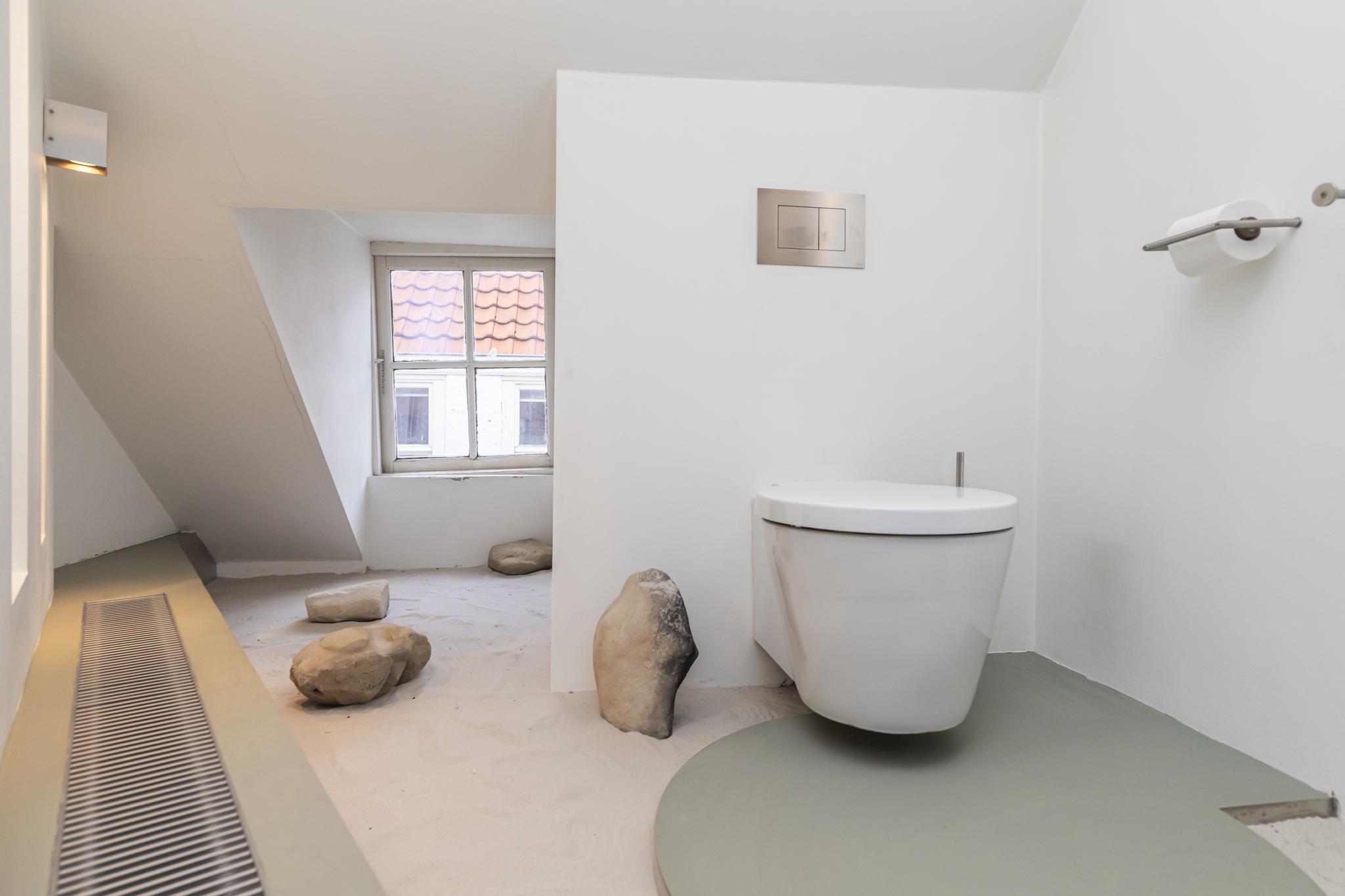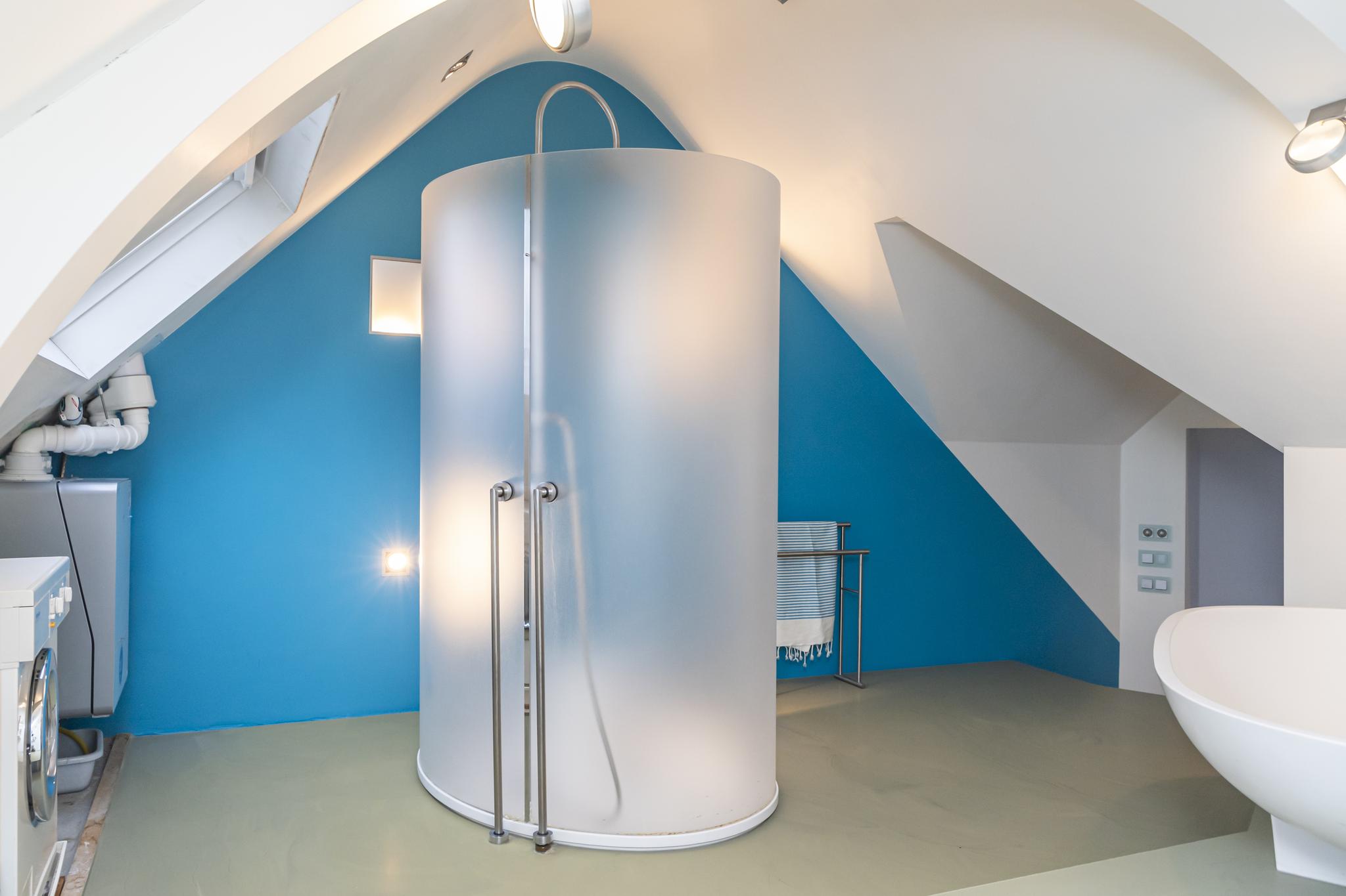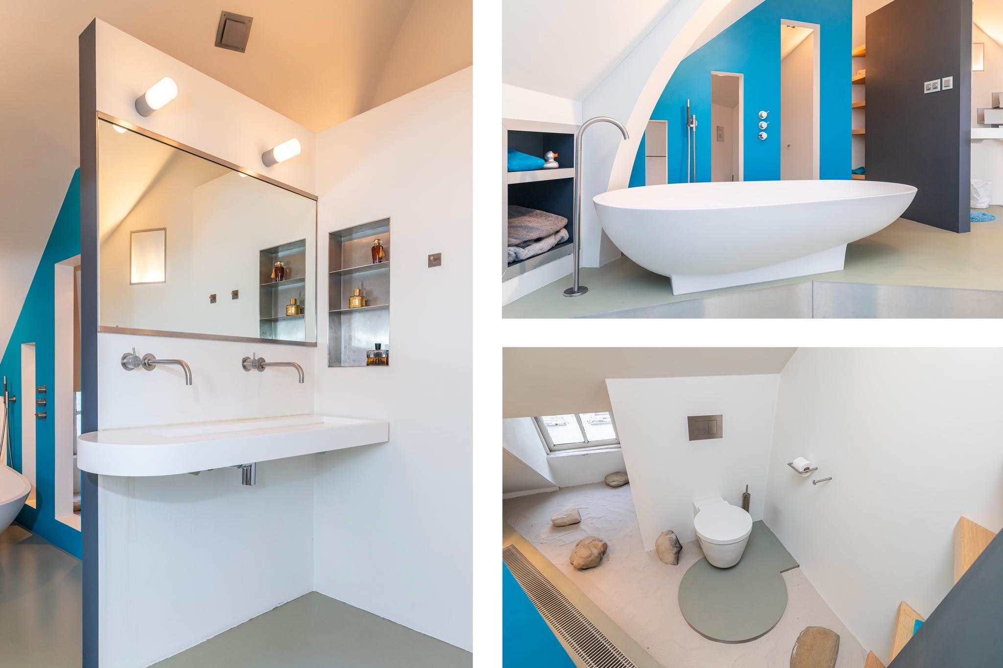 The next floor houses a spacious bedroom at the front, potentially divisible into two rooms, and a unique bathroom at the back. The bathroom features a freestanding shower cabin, freestanding bath, double sink, washing machine setup, and a Nefit HR boiler from 2017.
