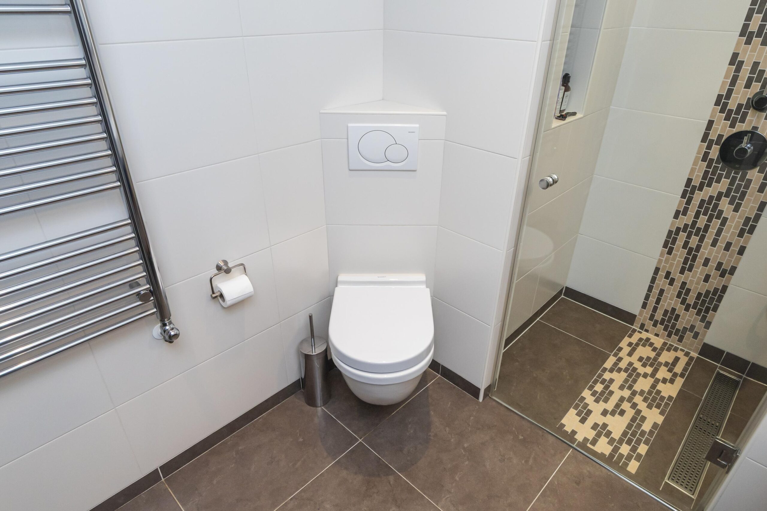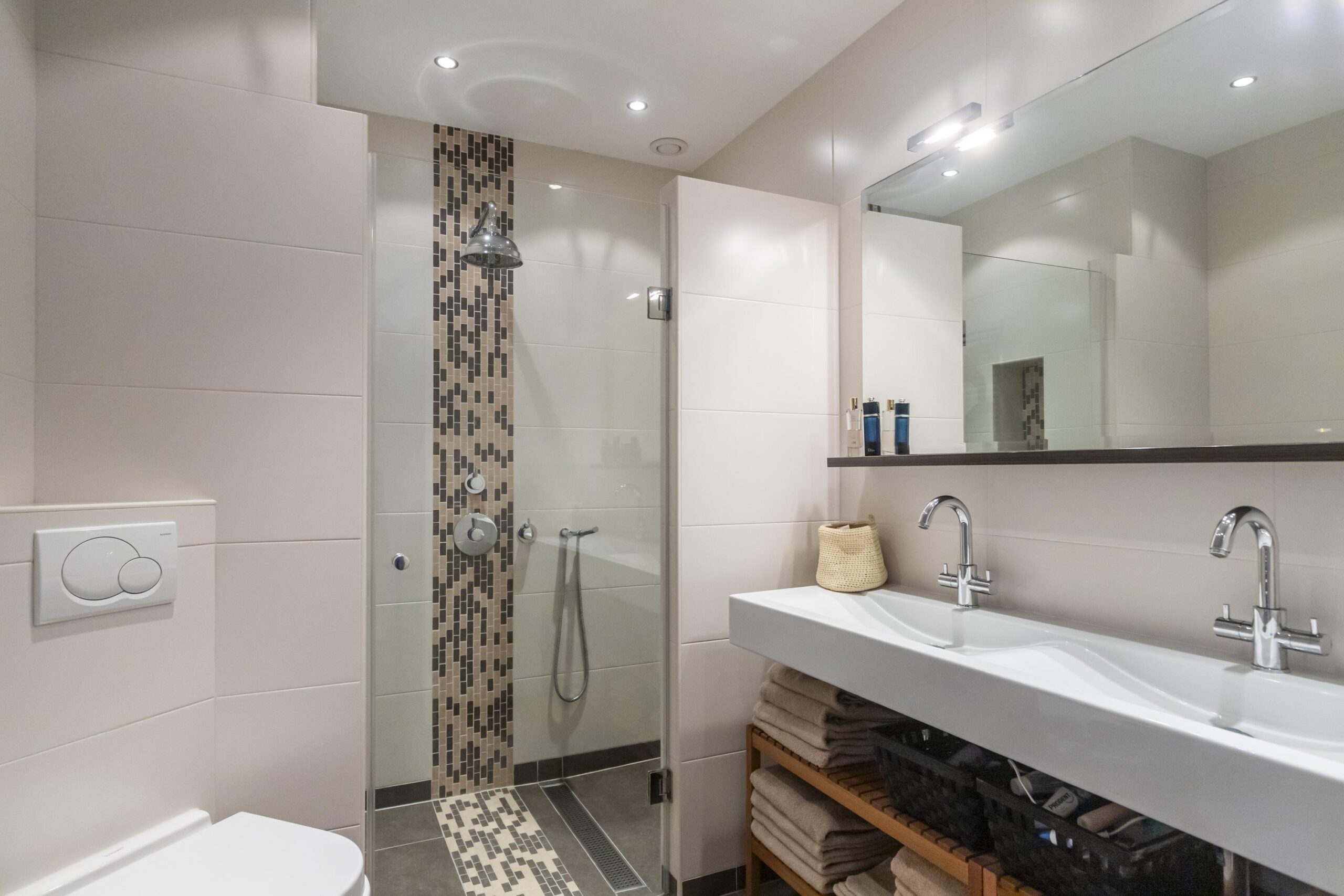 - Badkamervoorzieningen Toilet, douche, dubbele wastafel
