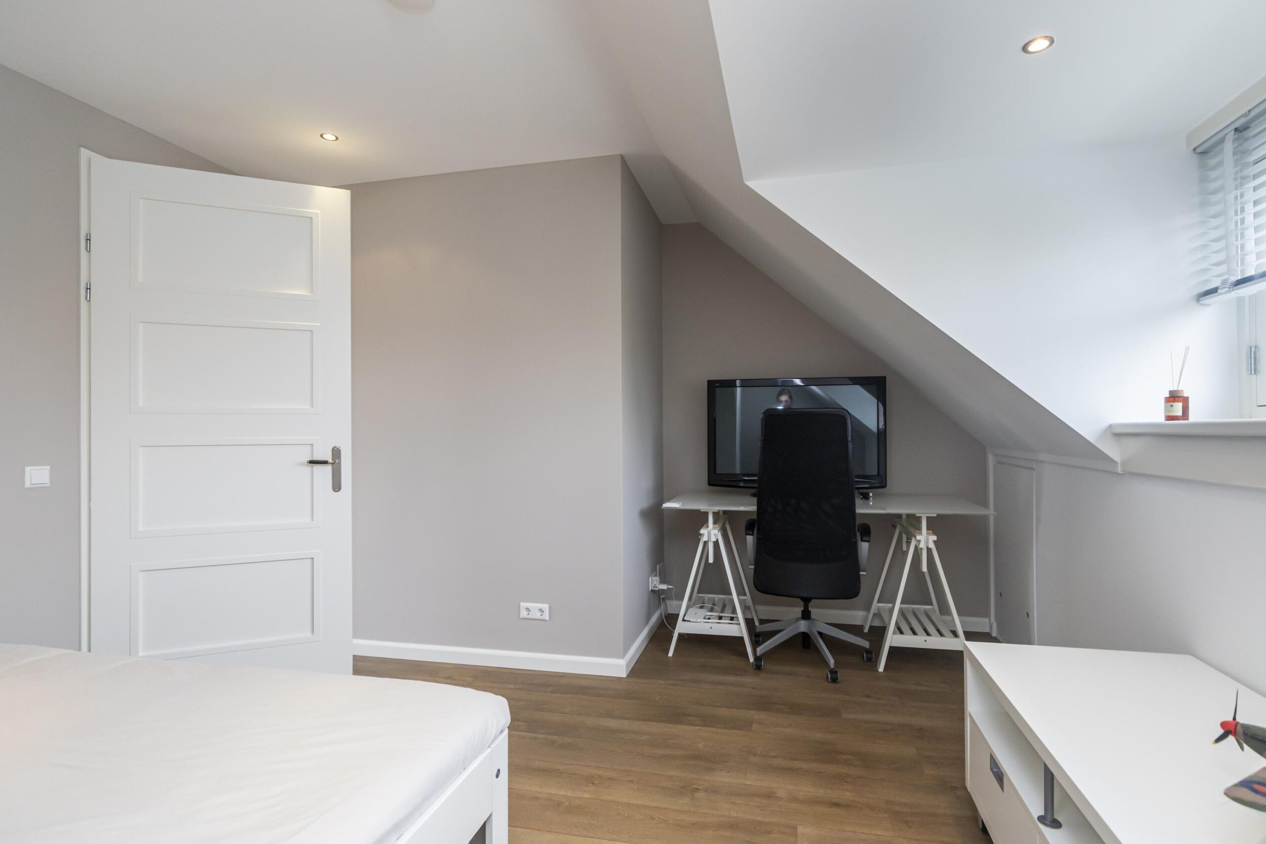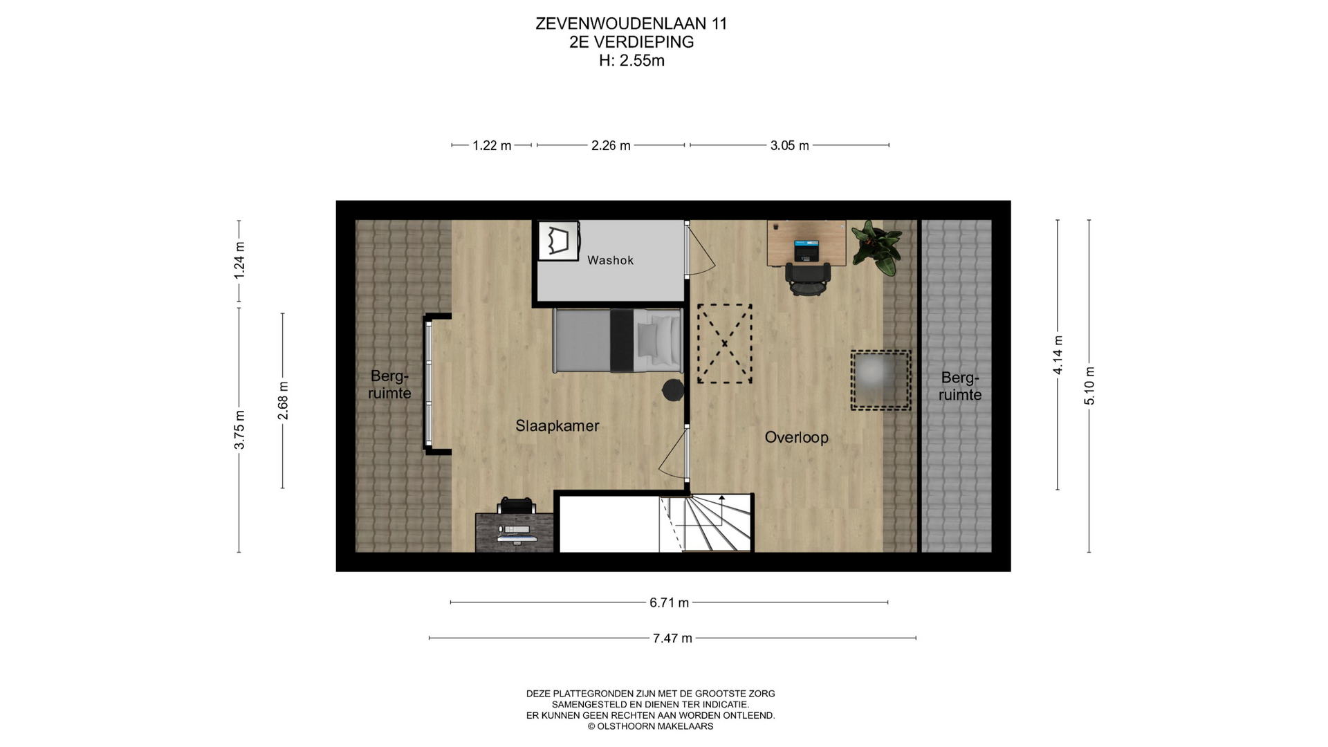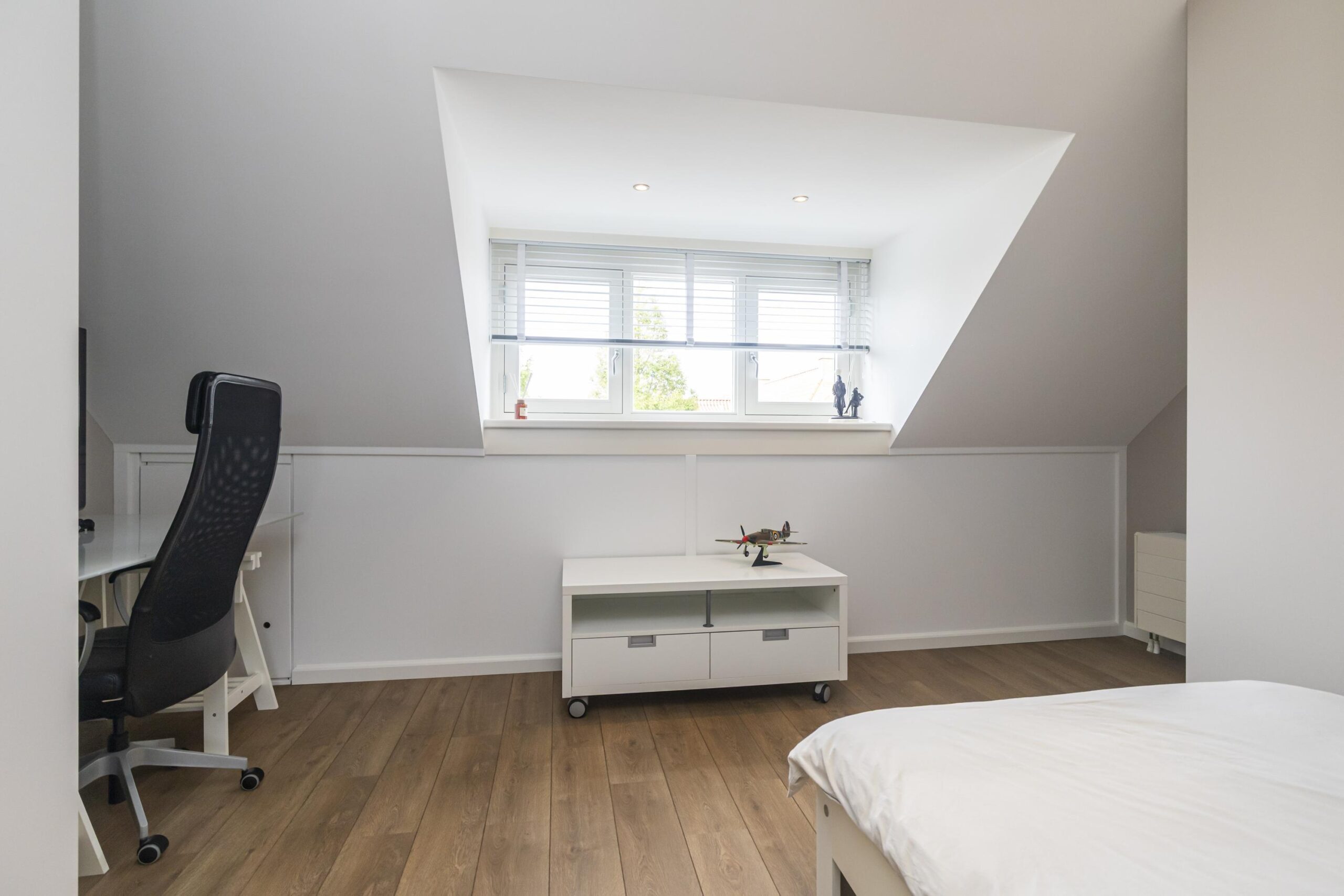 Riante overloop met dakraam waar met gemak een hobby-/studeerkamer gecreëerd kan worden. Hier bevindt zich een bergkast met wasmachine- en wasdrogeraansluiting, een vlizo trap met toegang tot de vliering. Een riante slaapkamer met dakkapel gelegen aan de voorzijde van de woning. Op de gehele etage bevindt zich bergruimte achter de knieschotten.
